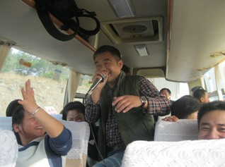 7:57,我們的旅行正式啟航了。一路之上,大家歡歌笑語,情誼融融。娛樂之中,更是形式百出,其中《斗牛》的呼喊聲更是讓人激情四溢。車內車外,風彩各現,胡董在此情此景的觸動下,興然謂詩一首: