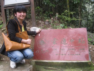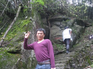 往上走的小徑越來越陡峭,在下山的人口中得知,索道中站就在前方不遠的地方,心中暗喜:實在走不動,就坐纜車上去。15分鐘,我們順利的達到了索道中站,大家爭相拍照留念。現在想想,唯獨,一心只想著休息的我,沒有在此處拍一張照片做紀念。現在看著他們婀娜、多姿的pose,讓人羨慕。旁邊的袁工在我前方喊著:“戴工,前面是一片平地,你手上的小竹桿可以扔掉了。”其實,我早就想扔了,借袁工的話,我順勢放棄了與小竹桿握手的機會。休息的時候,我也在想,這么累,胡董肯定會說我們坐纜車上去的。然而,事非這般。胡董休息了一會兒喊著:“前面不遠的地方,就是山頂了,我們繼續徒步前進,如果累了,我們每算200步就休息一下,先小目標,再大目標。”
